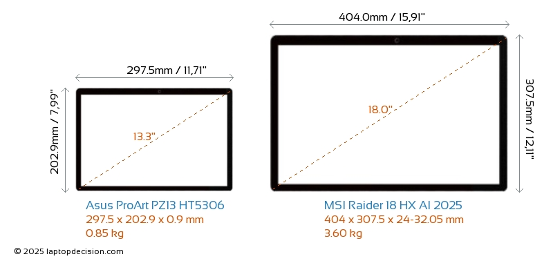 HDMI Raider 18 HX AI 2025 features an HDMI port (1x HDMI 2.1) for connecting to external monitors. ProArt PZ13 HT5306 does not have an HDMI port.