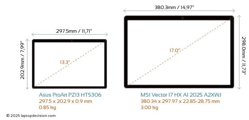 HDMI Vector 17 HX AI 2025 A2XWJ features an HDMI port (1x HDMI 2.1) for connecting to external monitors. ProArt PZ13 HT5306 does not have an HDMI port.