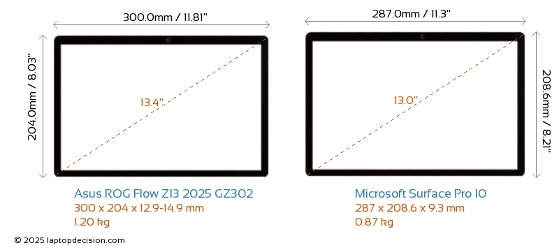 HDMI ROG Flow Z13 2025 GZ302 features an HDMI port (1x HDMI 2.1) for connecting to external monitors. Surface Pro 10 does not have an HDMI port.