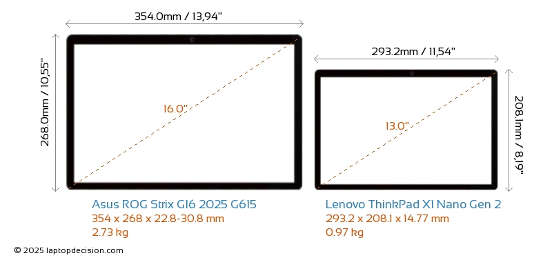 HDMI ROG Strix G16 2025 G615 features an HDMI port (1x HDMI 2.1) for connecting to external monitors. ThinkPad X1 Nano Gen 2 does not have an HDMI port.