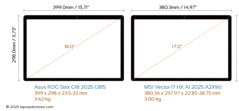 USBBoth ROG Strix G18 2025 G815 and Vector 17 HX AI 2025 A2XWJ have USB-A ports. ROG Strix G18 2025 G815 has 3x USB 3.2 USB-A ports, while Vector 17 HX AI 2025 A2XWJ has 2x USB 3.2 USB-A ports.Both ROG Strix G18 2025 G815 and Vector 17 HX AI 2025 A2XWJ have USB Type-C ports. ROG Strix G18 2025 G815 has 2x USB 4.0 USB Type-C ports, while Vector 17 HX AI 2025 A2XWJ has 2x USB 3.2 USB Type-C ports.