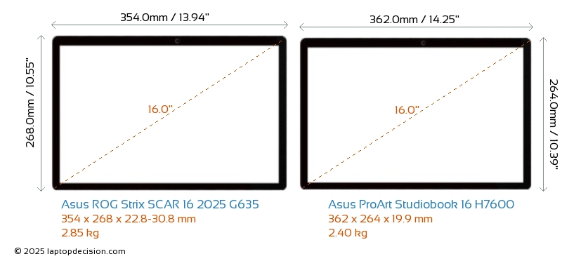 SD Card Reader ProArt Studiobook 16 H7600 is equipped with an SD Card Reader for easy access to memory cards. ROG Strix SCAR 16 2025 G635 does not have an SD Card Reader.