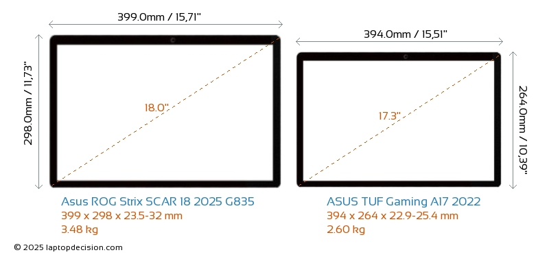 USBBoth ROG Strix SCAR 18 2025 G835 and TUF Gaming A17 2022 have USB-A ports. ROG Strix SCAR 18 2025 G835 has 3x USB 3.2 USB-A ports, while TUF Gaming A17 2022 has 2x USB 3.2 USB-A ports.Both ROG Strix SCAR 18 2025 G835 and TUF Gaming A17 2022 have USB Type-C ports. ROG Strix SCAR 18 2025 G835 has 2x USB 4.0 USB Type-C ports, while TUF Gaming A17 2022 has 2x USB 3.2 USB Type-C ports.