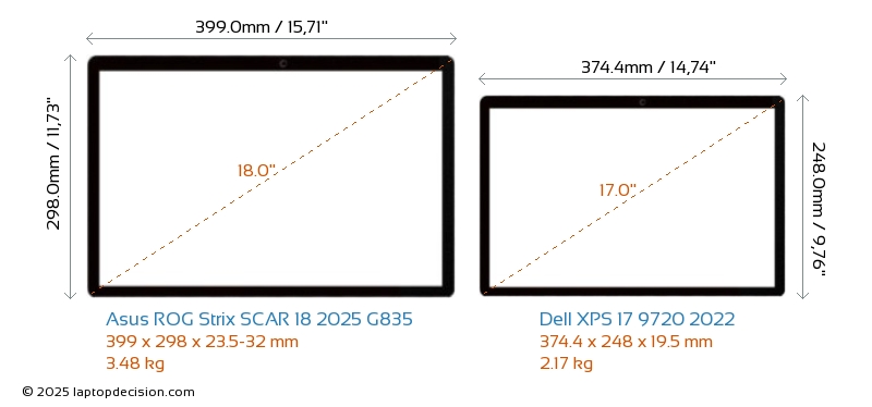 HDMI ROG Strix SCAR 18 2025 G835 features an HDMI port (1x HDMI 2.1) for connecting to external monitors. XPS 17 9720 2022 does not have an HDMI port.