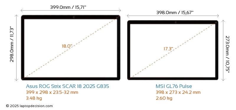 USBBoth ROG Strix SCAR 18 2025 G835 and GL76 Pulse feature 3x USB 3.2 USB-A ports.Both ROG Strix SCAR 18 2025 G835 and GL76 Pulse have USB Type-C ports. ROG Strix SCAR 18 2025 G835 has 2x USB 4.0 USB Type-C ports, while GL76 Pulse has 1x USB 3.2 USB Type-C ports.
