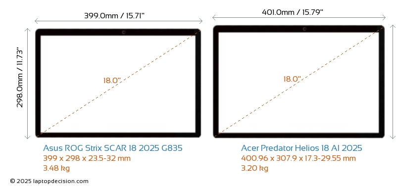USBBoth ROG Strix SCAR 18 2025 G835 and Predator Helios 18 AI 2025 feature 3x USB 3.2 USB-A ports.Both ROG Strix SCAR 18 2025 G835 and Predator Helios 18 AI 2025 feature 2x USB 4.0 USB Type-C ports.