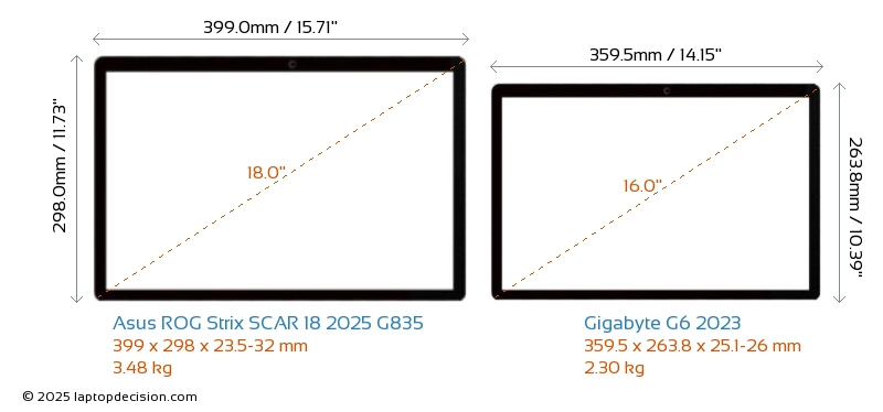 SD Card Reader G6 2023 is equipped with an SD Card Reader for easy access to memory cards. ROG Strix SCAR 18 2025 G835 does not have an SD Card Reader.