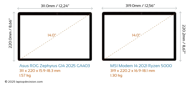 HDMIBoth ROG Zephyrus G14 2025 GA403 and Modern 14 2021 Ryzen 5000 feature an HDMI port. ROG Zephyrus G14 2025 GA403 offers 1x HDMI 2.1, while Modern 14 2021 Ryzen 5000 offers 1x HDMI 2.0.