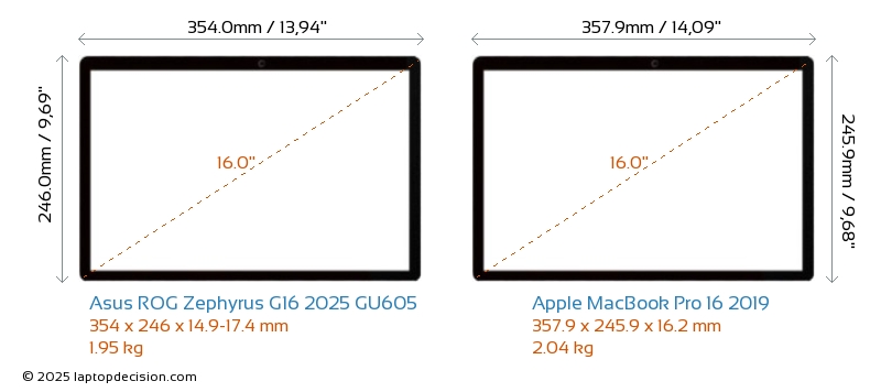HDMI ROG Zephyrus G16 2025 GU605 features an HDMI port (1x HDMI 2.1) for connecting to external monitors. MacBook Pro 16 2019 does not have an HDMI port.