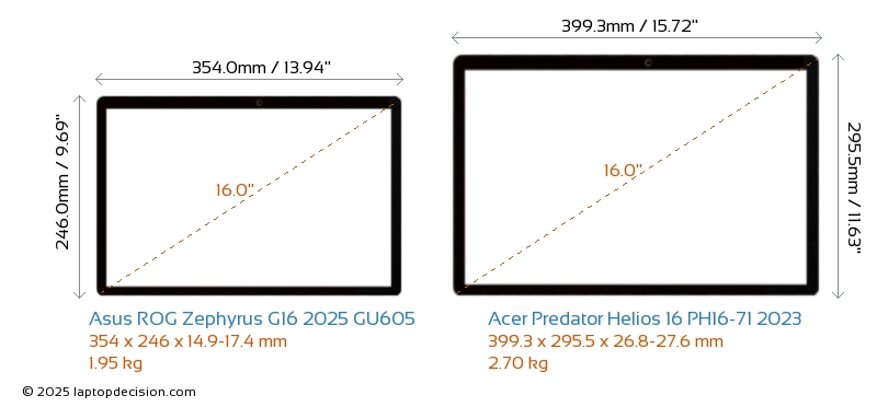 HDMIBoth ROG Zephyrus G16 2025 GU605 and Predator Helios 16 PH16-71 2023 feature an HDMI port (1x HDMI 2.1) for connecting to external monitors.