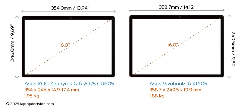 HDMIBoth ROG Zephyrus G16 2025 GU605 and Vivobook 16 X1605 feature an HDMI port. ROG Zephyrus G16 2025 GU605 offers 1x HDMI 2.1, while Vivobook 16 X1605 offers 1x HDMI 1.4.