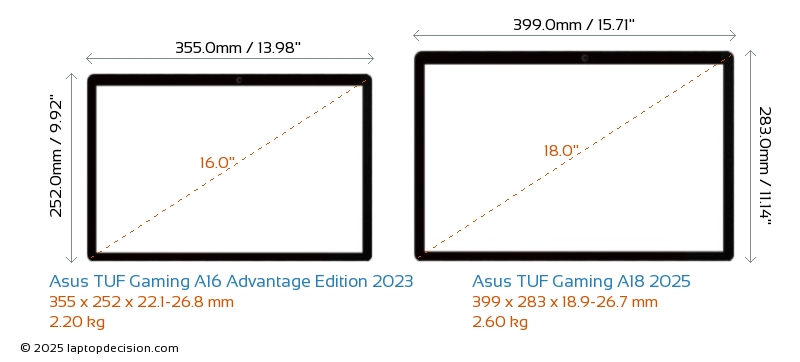 USBBoth TUF Gaming A16 Advantage Edition 2023 and TUF Gaming A18 2025 have USB-A ports. TUF Gaming A16 Advantage Edition 2023 has 2x USB 3.2 USB-A ports, while TUF Gaming A18 2025 has 3x USB 3.2 USB-A ports.Both TUF Gaming A16 Advantage Edition 2023 and TUF Gaming A18 2025 have USB Type-C ports. TUF Gaming A16 Advantage Edition 2023 has 2x USB 3.2 USB Type-C ports, while TUF Gaming A18 2025 has 1x USB 4.0 USB Type-C ports.