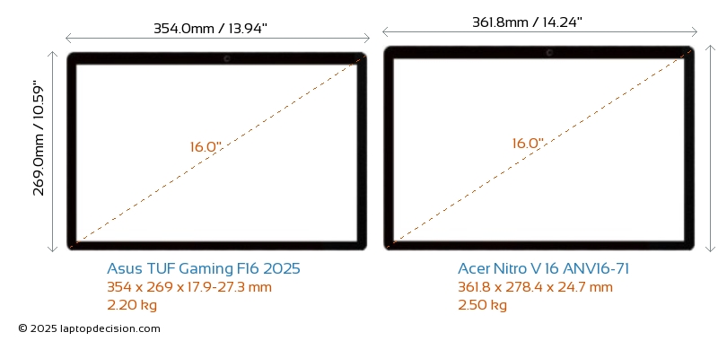 USBBoth TUF Gaming F16 2025 and Nitro V 16 ANV16-71 have USB-A ports. TUF Gaming F16 2025 has 3x USB 3.2 USB-A ports, while Nitro V 16 ANV16-71 has 2x USB 3.2 USB-A ports.Both TUF Gaming F16 2025 and Nitro V 16 ANV16-71 have USB Type-C ports. TUF Gaming F16 2025 has 2x USB 3.2 USB Type-C ports, while Nitro V 16 ANV16-71 has 1x USB 4.0 USB Type-C ports.