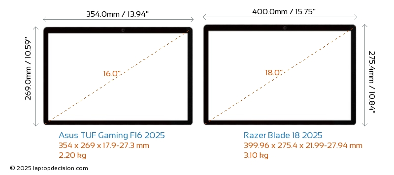 USBBoth TUF Gaming F16 2025 and Blade 18 2025 feature 3x USB 3.2 USB-A ports.Both TUF Gaming F16 2025 and Blade 18 2025 have USB Type-C ports. TUF Gaming F16 2025 has 2x USB 3.2 USB Type-C ports, while Blade 18 2025 has 2x USB 4.0 USB Type-C ports.
