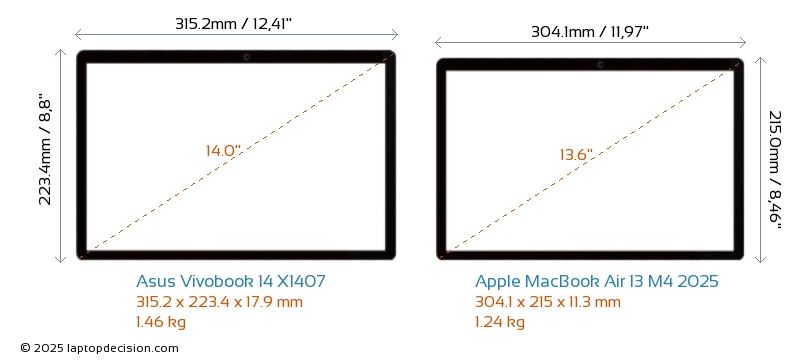 HDMI Vivobook 14 X1407 features an HDMI port (1x HDMI 1.4) for connecting to external monitors. MacBook Air 13 M4 2025 does not have an HDMI port.
