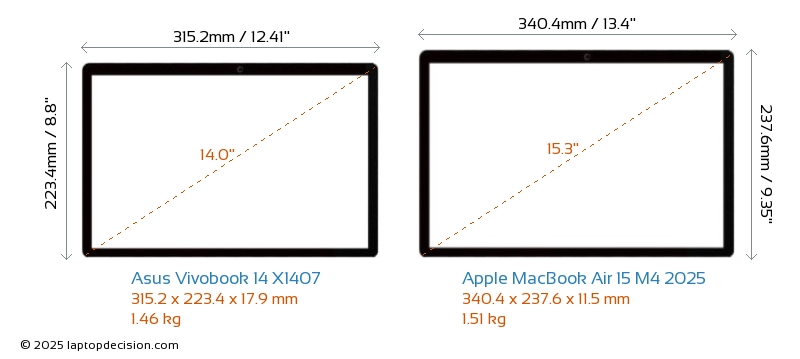 HDMI Vivobook 14 X1407 features an HDMI port (1x HDMI 1.4) for connecting to external monitors. MacBook Air 15 M4 2025 does not have an HDMI port.