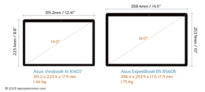 HDMIBoth Vivobook 14 X1407 and ExpertBook B5 B5605 feature an HDMI port. Vivobook 14 X1407 offers 1x HDMI 1.4, while ExpertBook B5 B5605 offers 1x HDMI 2.1.