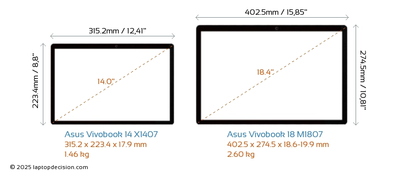 HDMIBoth Vivobook 14 X1407 and Vivobook 18 M1807 feature an HDMI port. Vivobook 14 X1407 offers 1x HDMI 1.4, while Vivobook 18 M1807 offers 1x HDMI 2.1.