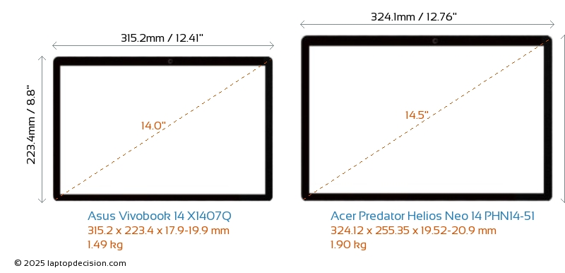 HDMIBoth Vivobook 14 X1407Q and Predator Helios Neo 14 PHN14-51 feature an HDMI port (1x HDMI 2.1) for connecting to external monitors.