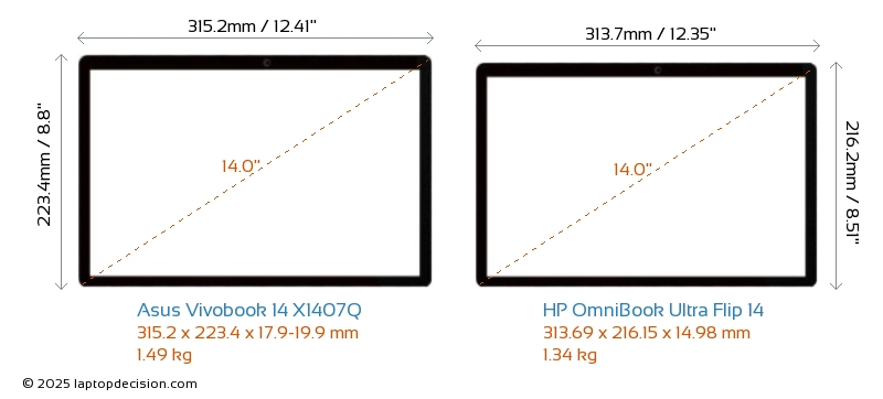 HDMI Vivobook 14 X1407Q features an HDMI port (1x HDMI 2.1) for connecting to external monitors. OmniBook Ultra Flip 14 does not have an HDMI port.