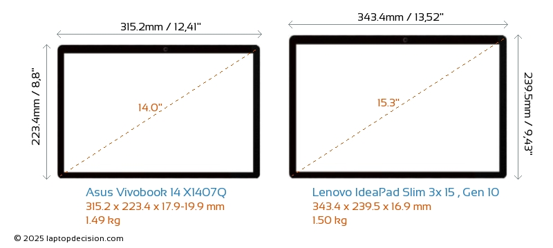 HDMIBoth Vivobook 14 X1407Q and IdeaPad Slim 3x 15 , Gen 10 feature an HDMI port. Vivobook 14 X1407Q offers 1x HDMI 2.1, while IdeaPad Slim 3x 15 , Gen 10 offers 1x HDMI 1.4.