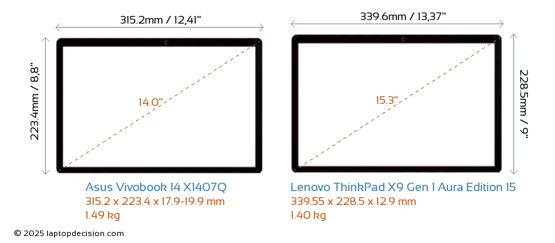 HDMIBoth Vivobook 14 X1407Q and ThinkPad X9 Gen 1 Aura Edition 15 feature an HDMI port (1x HDMI 2.1) for connecting to external monitors.