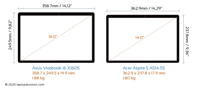 USBBoth Vivobook 16 X1605 and Aspire 5 A514-55 feature 3x USB 3.2 USB-A ports.Both Vivobook 16 X1605 and Aspire 5 A514-55 feature 1x USB 3.2 USB Type-C ports.