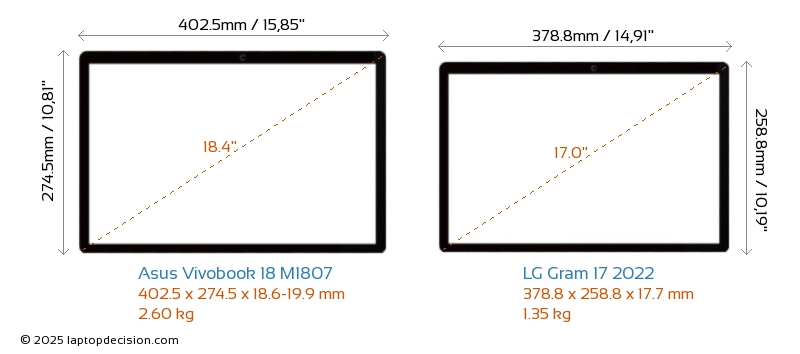 HDMIBoth Vivobook 18 M1807 and Gram 17 2022 feature an HDMI port. Vivobook 18 M1807 offers 1x HDMI 2.1, while Gram 17 2022 offers 1x HDMI 2.0.