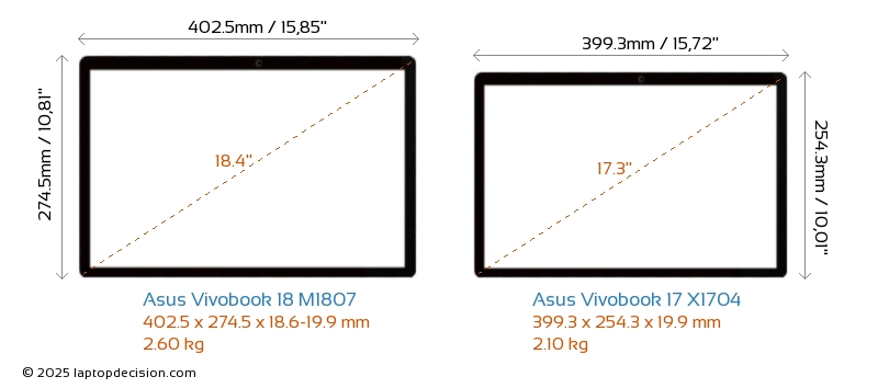 HDMIBoth Vivobook 18 M1807 and Vivobook 17 X1704 feature an HDMI port. Vivobook 18 M1807 offers 1x HDMI 2.1, while Vivobook 17 X1704 offers 1x HDMI 1.4.