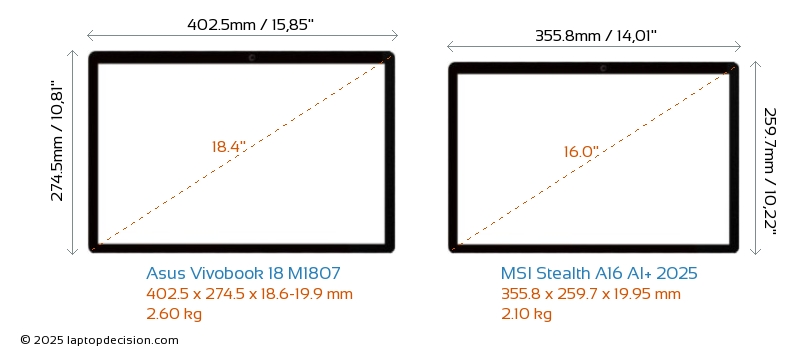 USBBoth Vivobook 18 M1807 and Stealth A16 AI+ 2025 feature 2x USB 3.2 USB-A ports.Both Vivobook 18 M1807 and Stealth A16 AI+ 2025 have USB Type-C ports. Vivobook 18 M1807 has 2x USB 4.0 USB Type-C ports, while Stealth A16 AI+ 2025 has 1x USB 4.0 USB Type-C ports.