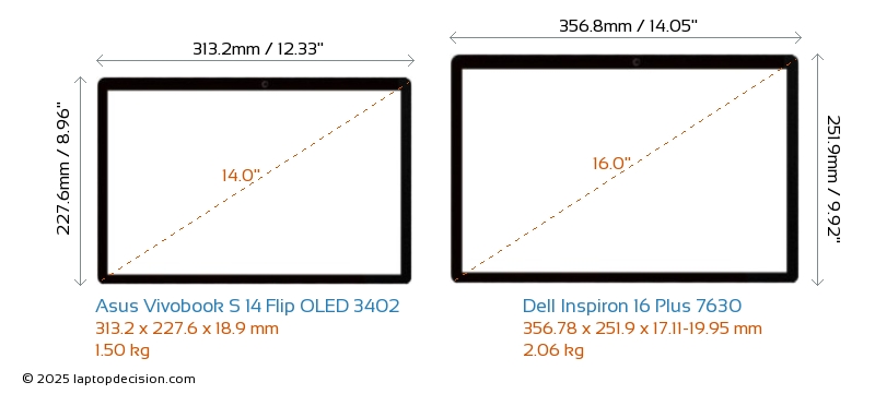 HDMIBoth Vivobook S 14 Flip OLED 3402 and Inspiron 16 Plus 7630 feature an HDMI port. Vivobook S 14 Flip OLED 3402 offers 1x HDMI 2.1, while Inspiron 16 Plus 7630 offers 1x HDMI 2.0.