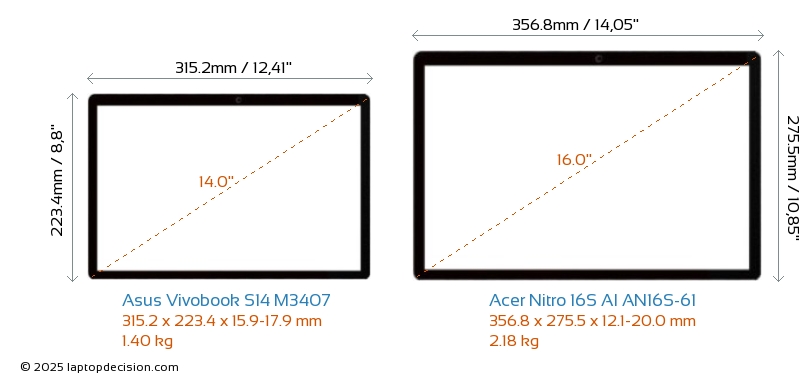 HDMIBoth Vivobook S14 M3407 and Nitro 16S AI AN16S-61 feature an HDMI port (1x HDMI 2.1) for connecting to external monitors.
