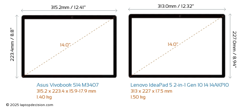 USBBoth Vivobook S14 M3407 and IdeaPad 5 2-in-1 Gen 10 14 14AKP10 feature 2x USB 3.2 USB-A ports.Both Vivobook S14 M3407 and IdeaPad 5 2-in-1 Gen 10 14 14AKP10 feature 2x USB 4.0 USB Type-C ports.