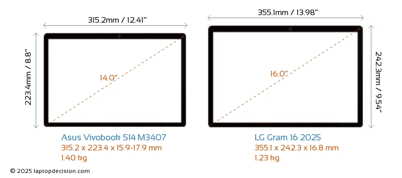 SD Card Reader Gram 16 2025 is equipped with an SD Card Reader for easy access to memory cards. Vivobook S14 M3407 does not have an SD Card Reader.