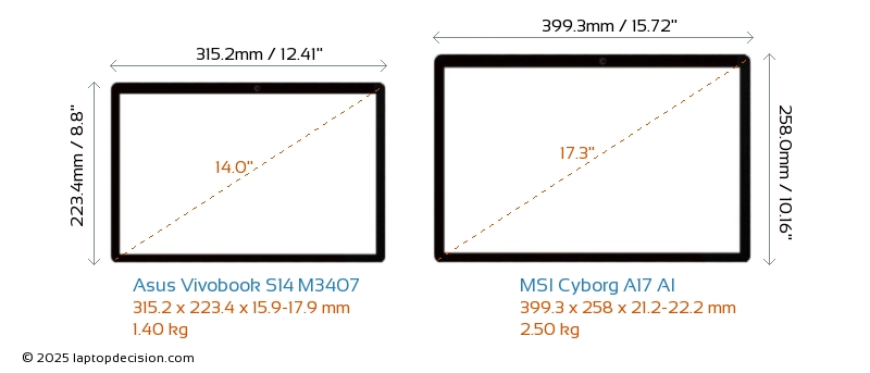 USBBoth Vivobook S14 M3407 and Cyborg A17 AI feature 2x USB 3.2 USB-A ports.Both Vivobook S14 M3407 and Cyborg A17 AI have USB Type-C ports. Vivobook S14 M3407 has 2x USB 4.0 USB Type-C ports, while Cyborg A17 AI has 1x USB 3.2 USB Type-C ports.