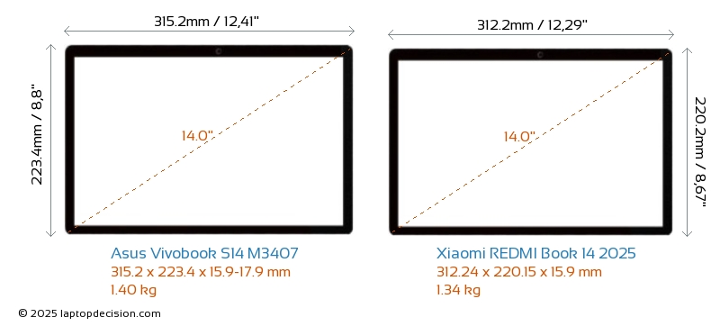 USBBoth Vivobook S14 M3407 and REDMI Book 14 2025 feature 2x USB 3.2 USB-A ports.Both Vivobook S14 M3407 and REDMI Book 14 2025 feature 2x USB 4.0 USB Type-C ports.