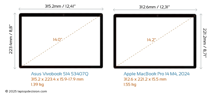 Thunderbolt MacBook Pro 14 M4, 2024 is equipped with Thunderbolt 4 port. Vivobook S14 S3407Q does not have Thunderbolt port.