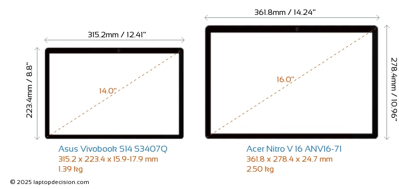 USBBoth Vivobook S14 S3407Q and Nitro V 16 ANV16-71 feature 2x USB 3.2 USB-A ports.Both Vivobook S14 S3407Q and Nitro V 16 ANV16-71 have USB Type-C ports. Vivobook S14 S3407Q has 2x USB 4.0 USB Type-C ports, while Nitro V 16 ANV16-71 has 1x USB 4.0 USB Type-C ports.
