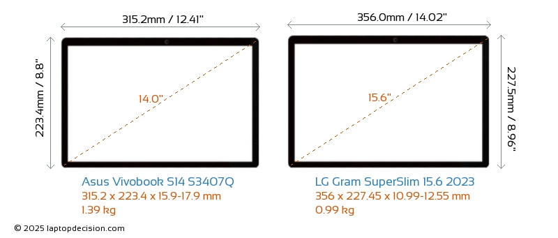 HDMI Vivobook S14 S3407Q features an HDMI port (1x HDMI 2.1) for connecting to external monitors. Gram SuperSlim 15.6 2023 does not have an HDMI port.
