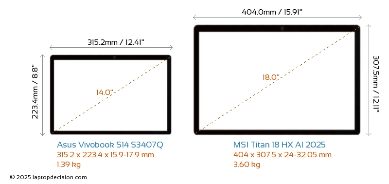 SD Card Reader Titan 18 HX AI 2025 is equipped with an SD Card Reader for easy access to memory cards. Vivobook S14 S3407Q does not have an SD Card Reader.