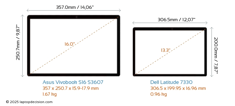 ThunderboltLatitude 7330 is equipped with Thunderbolt 4 port. Vivobook S16 S3607 does not have Thunderbolt port.