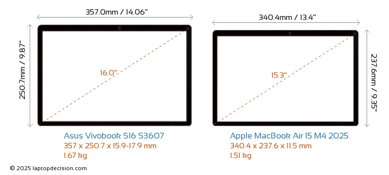 HDMI Vivobook S16 S3607 features an HDMI port (1x HDMI 2.1) for connecting to external monitors. MacBook Air 15 M4 2025 does not have an HDMI port.