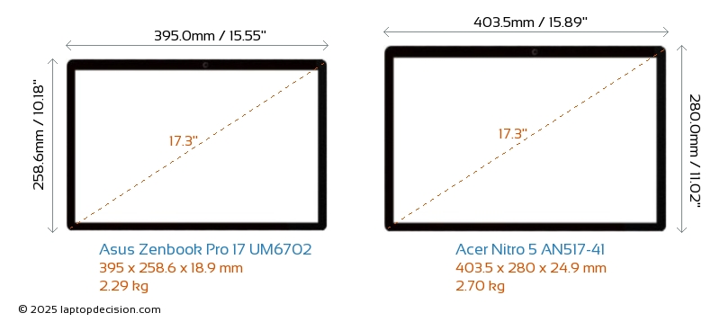 USBBoth Zenbook Pro 17 UM6702 and Nitro 5 AN517-41 have USB-A ports. Zenbook Pro 17 UM6702 has 2x USB 3.2 USB-A ports, while Nitro 5 AN517-41 has 3x USB 3.2 USB-A ports.Both Zenbook Pro 17 UM6702 and Nitro 5 AN517-41 have USB Type-C ports. Zenbook Pro 17 UM6702 has 2x USB 3.2 USB Type-C ports, while Nitro 5 AN517-41 has 1x USB 3.2 USB Type-C ports.