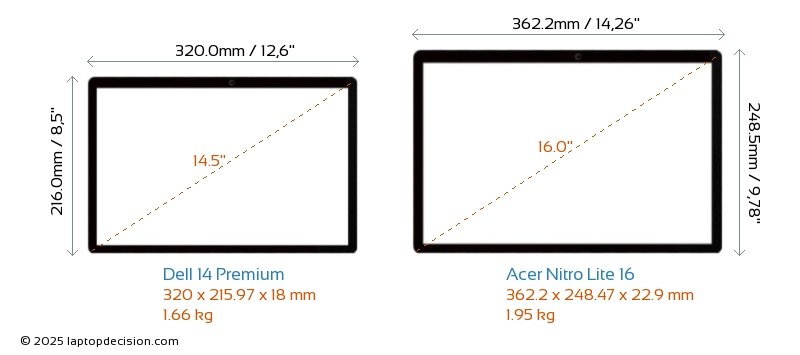 HDMI Nitro Lite 16 features an HDMI port (1x HDMI 2.1) for connecting to external monitors. 14 Premium does not have an HDMI port.
