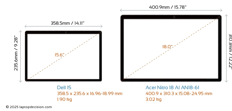 HDMIBoth 15 and Nitro 18 AI AN18-61 feature an HDMI port. 15 offers 1x HDMI 1.4, while Nitro 18 AI AN18-61 offers 1x HDMI 2.1.