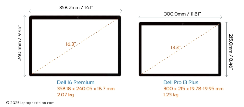 HDMI Pro 13 Plus features an HDMI port (1x HDMI 2.1) for connecting to external monitors. 16 Premium does not have an HDMI port.