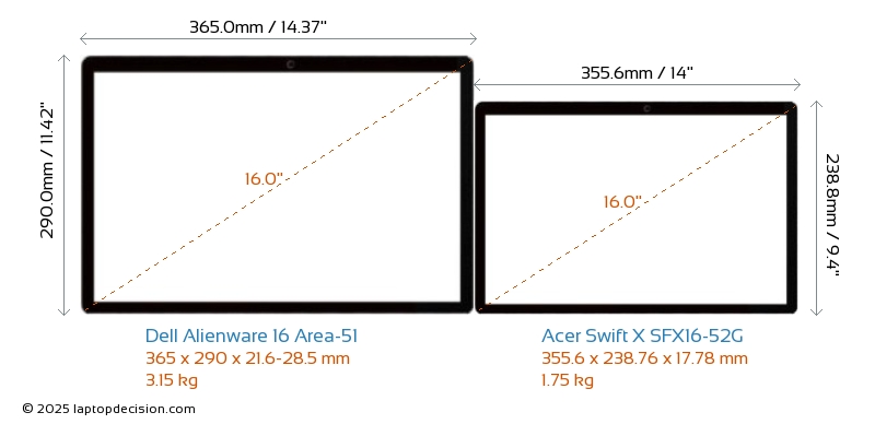 HDMIBoth Alienware 16 Area-51 and Swift X SFX16-52G feature an HDMI port. Alienware 16 Area-51 offers 1x HDMI 2.1, while Swift X SFX16-52G offers 1x HDMI 2.0.
