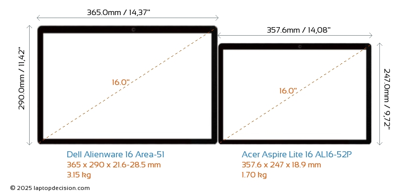 HDMIBoth Alienware 16 Area-51 and Aspire Lite 16 AL16-52P feature an HDMI port. Alienware 16 Area-51 offers 1x HDMI 2.1, while Aspire Lite 16 AL16-52P offers 1x HDMI 1.4.