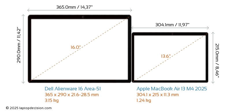 HDMI Alienware 16 Area-51 features an HDMI port (1x HDMI 2.1) for connecting to external monitors. MacBook Air 13 M4 2025 does not have an HDMI port.