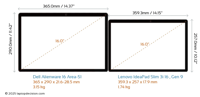HDMIBoth Alienware 16 Area-51 and IdeaPad Slim 3i 16 , Gen 9 feature an HDMI port. Alienware 16 Area-51 offers 1x HDMI 2.1, while IdeaPad Slim 3i 16 , Gen 9 offers 1x HDMI 1.4.